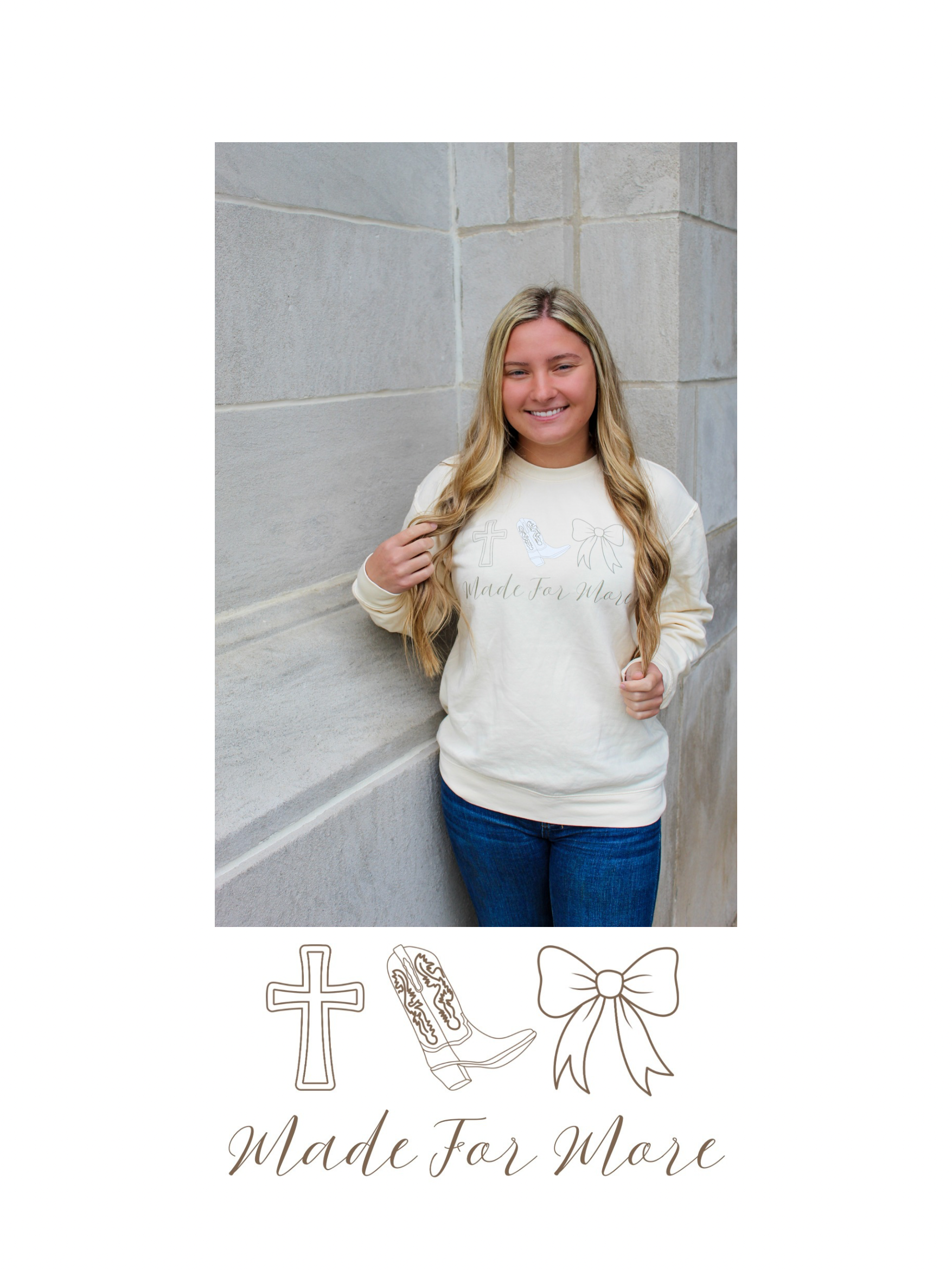 Design featured on an ivory crewneck with light brown ink - Made For More