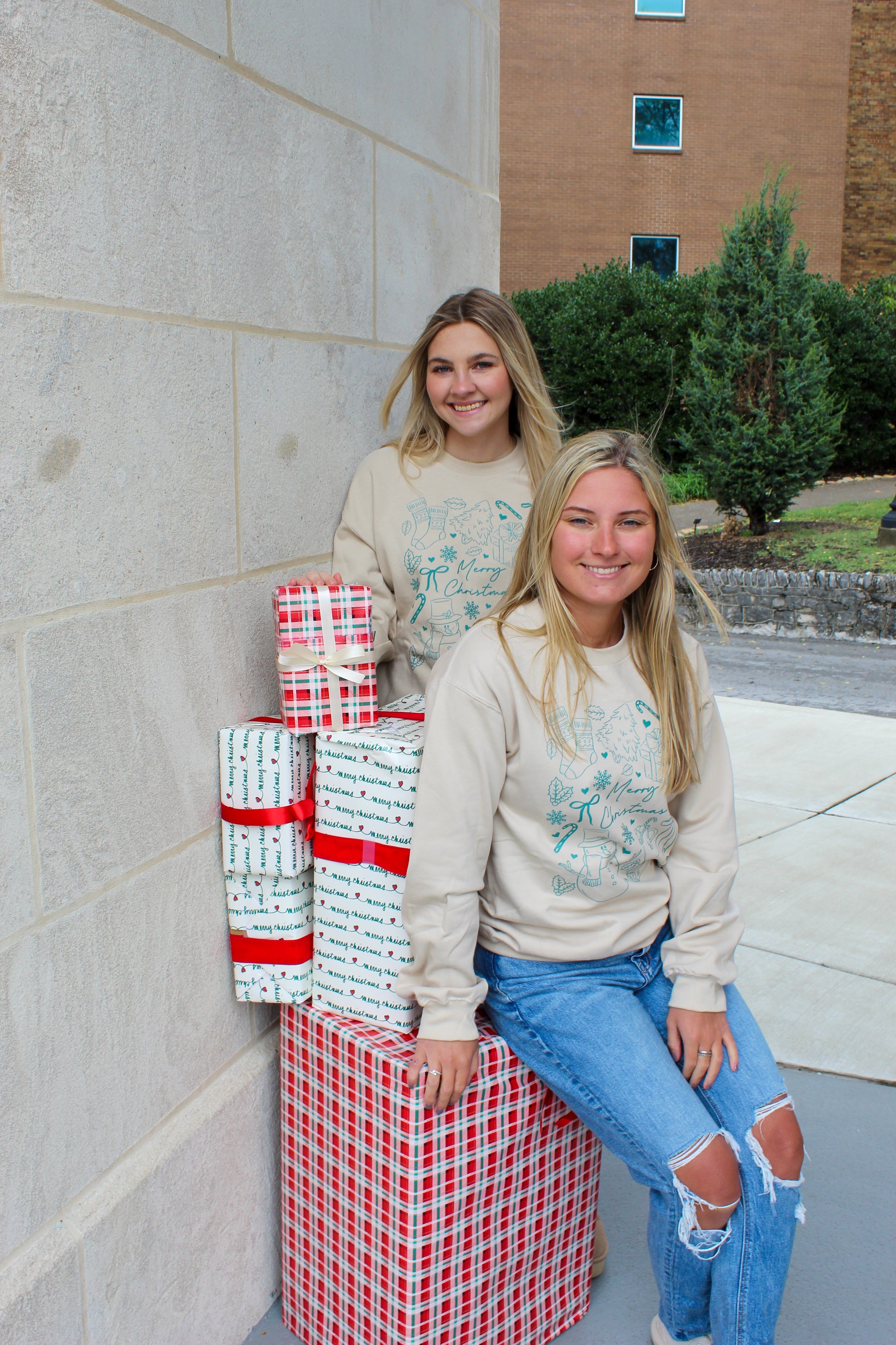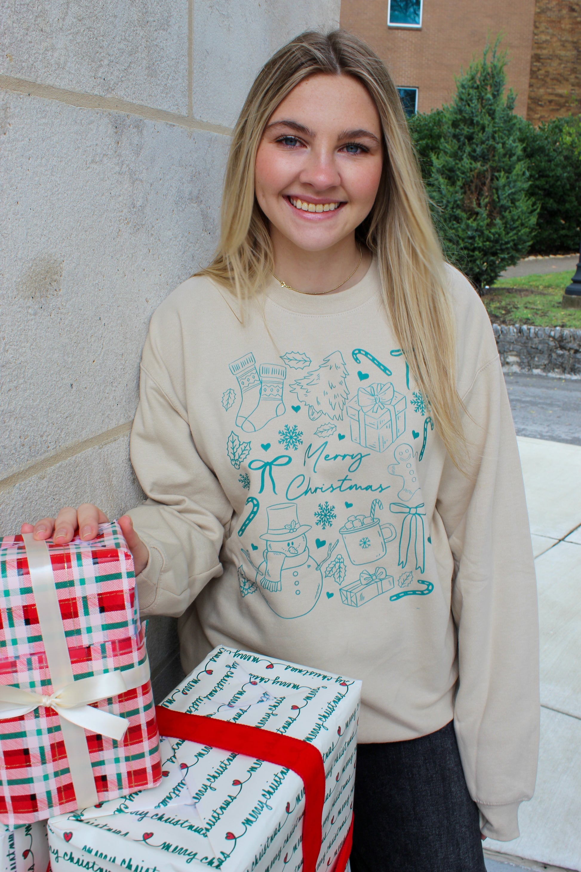 Expertly crafted for the holiday season, our Dainty Christmas Knick Knack sweater features a festive tan crewneck collar adorned with a whimsical array of random green Christmas knickknacks. Perfect for spreading joy and celebrating the most wonderful time of the year.