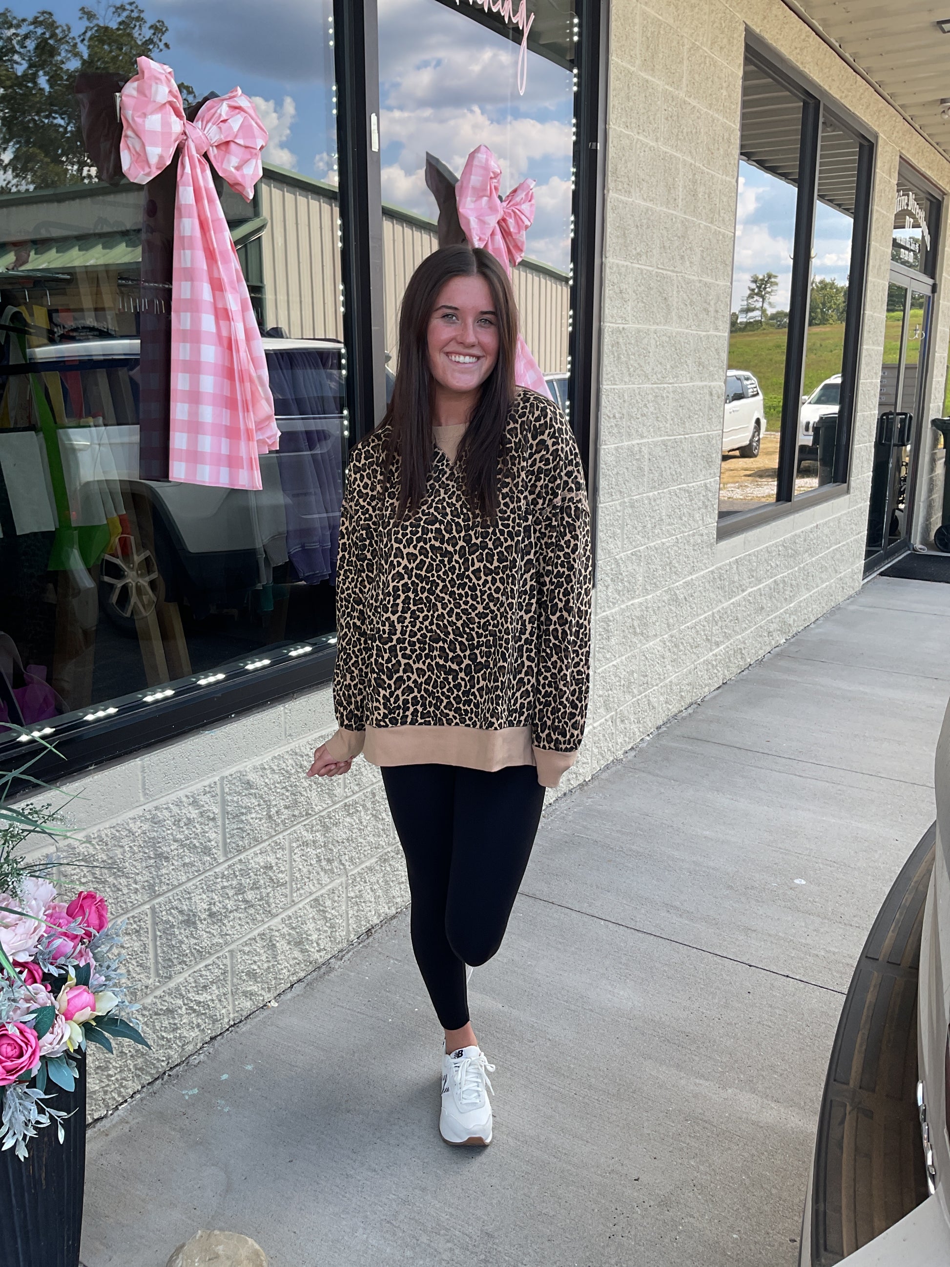 Stay stylish in the wild with our In The Wild Crew! Featuring a comfortable leopard print, this top is perfect for any adventure. The soft material makes it perfect for long hikes or lounging at home. Be ready to take on any terrain with this must-have piece.