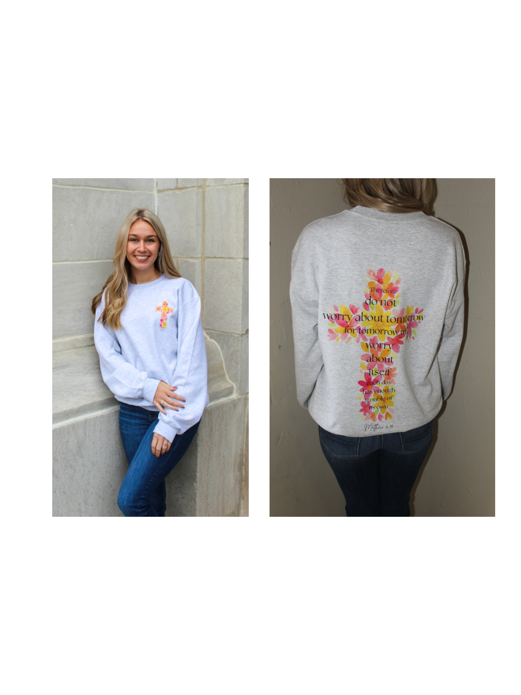 As a mother, anxious thoughts can sometimes slip into mind, but leaning towards Christ in these times gives peace. That’s exactly why I decided this was my design! It was created with the intention of mirroring exactly how verse Matthew 6:34 makes me feel. The bright colors with the watercolor flowers brings warmth and freshness, reminding me that even in times of worry, our God is a light, He is fresh. Verse Matthew 6:34 encourages me to live in the moment and trust that everything is as it’s meant to be. I hope this allows others to feel wrapped with faith and peace and a reminder that God has placed us exactly where we are meant to be.