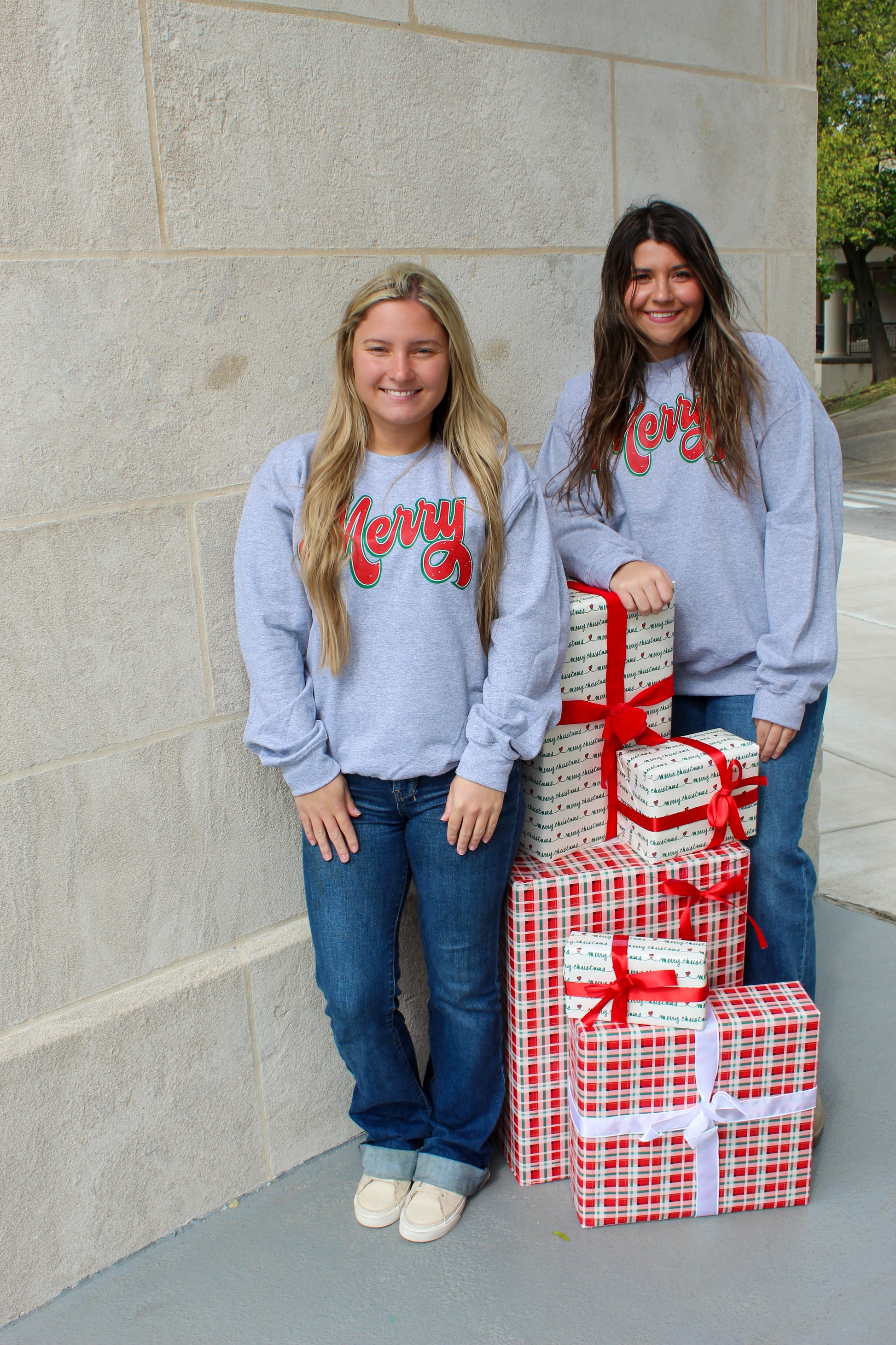 Introducing the Merry Christmas Crewneck, the perfect addition to your holiday wardrobe. Made of soft grey fabric, it features the festive colors of red and green, spelling out "Merry" across the front. Stay cozy and stylish this season with this must-have crewneck.