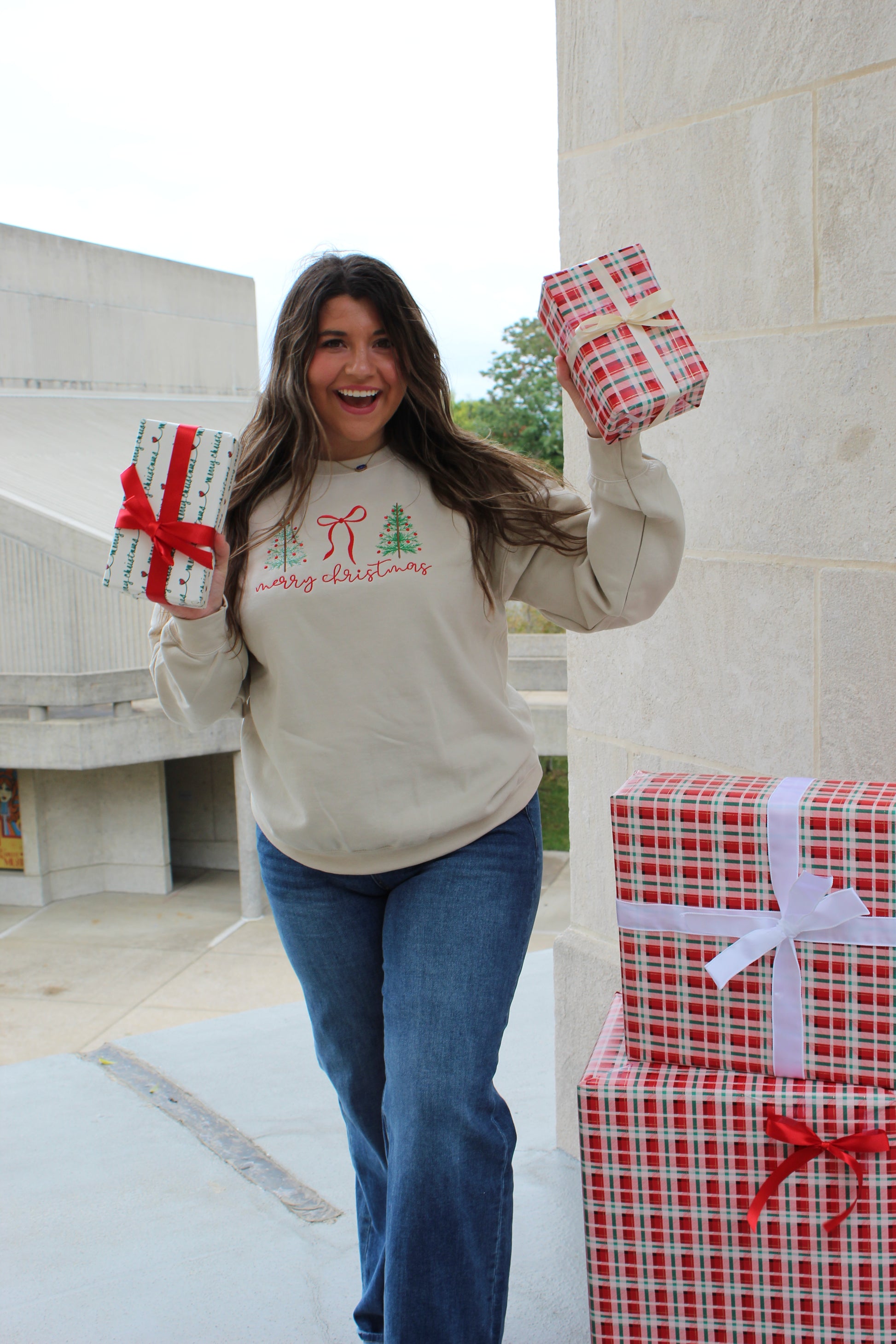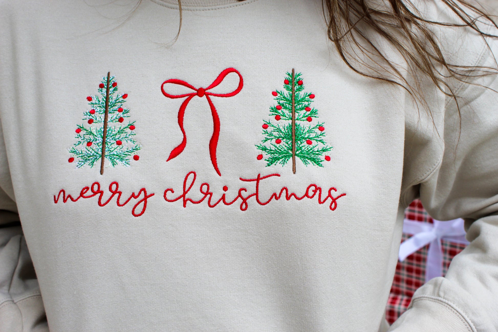 Transform your home into a festive wonderland with our Merry Christmas Embroidery. Made with a beautiful tan crew connected as Christmas trees and a bow that says "Merry Christmas," this elegant piece will add a touch of holiday cheer to any room. Spread the joy and warmth of the season with this must-have decoration.