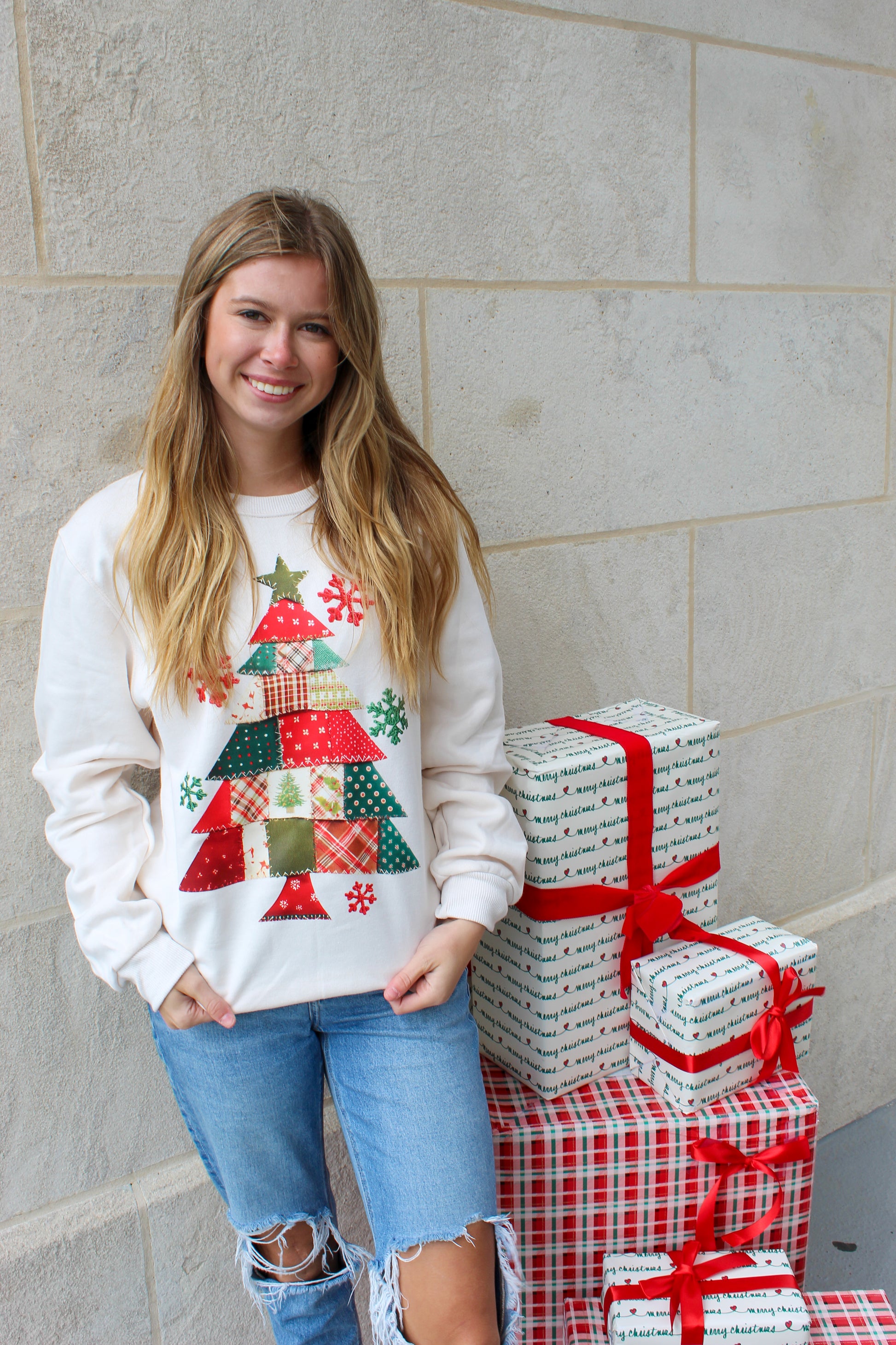 This cream crewneck boasts a festive patchwork Christmas tree design, perfect for the holiday season. Celebrate the joy of Christmas with this unique and cozy piece. Made with quality materials and expert craftsmanship, this product is sure to bring warmth and cheer to any occasion.