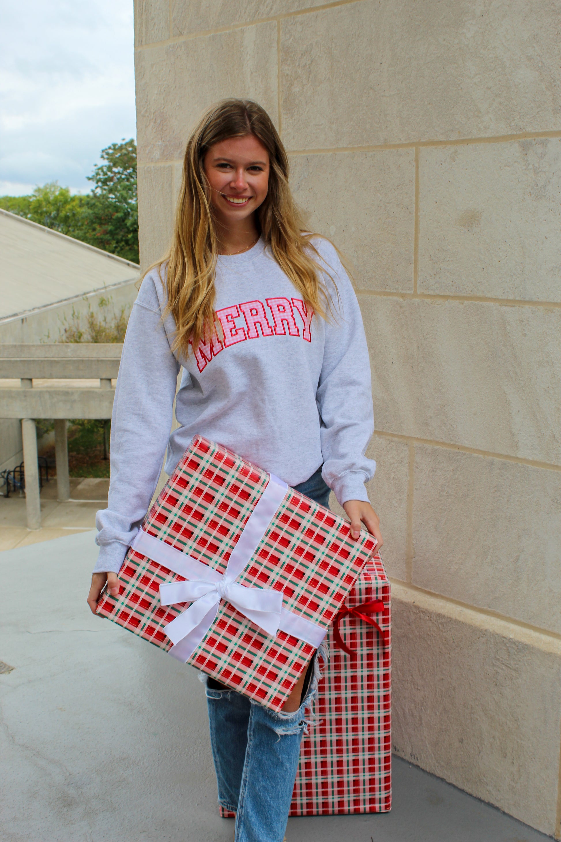 This cozy grey crewneck showcases the words "Merry" in vibrant pink and red embroidery. With its soft fabric and festive design, this top is perfect for spreading holiday cheer. Made for both style and comfort, it's a great addition to any winter wardrobe.