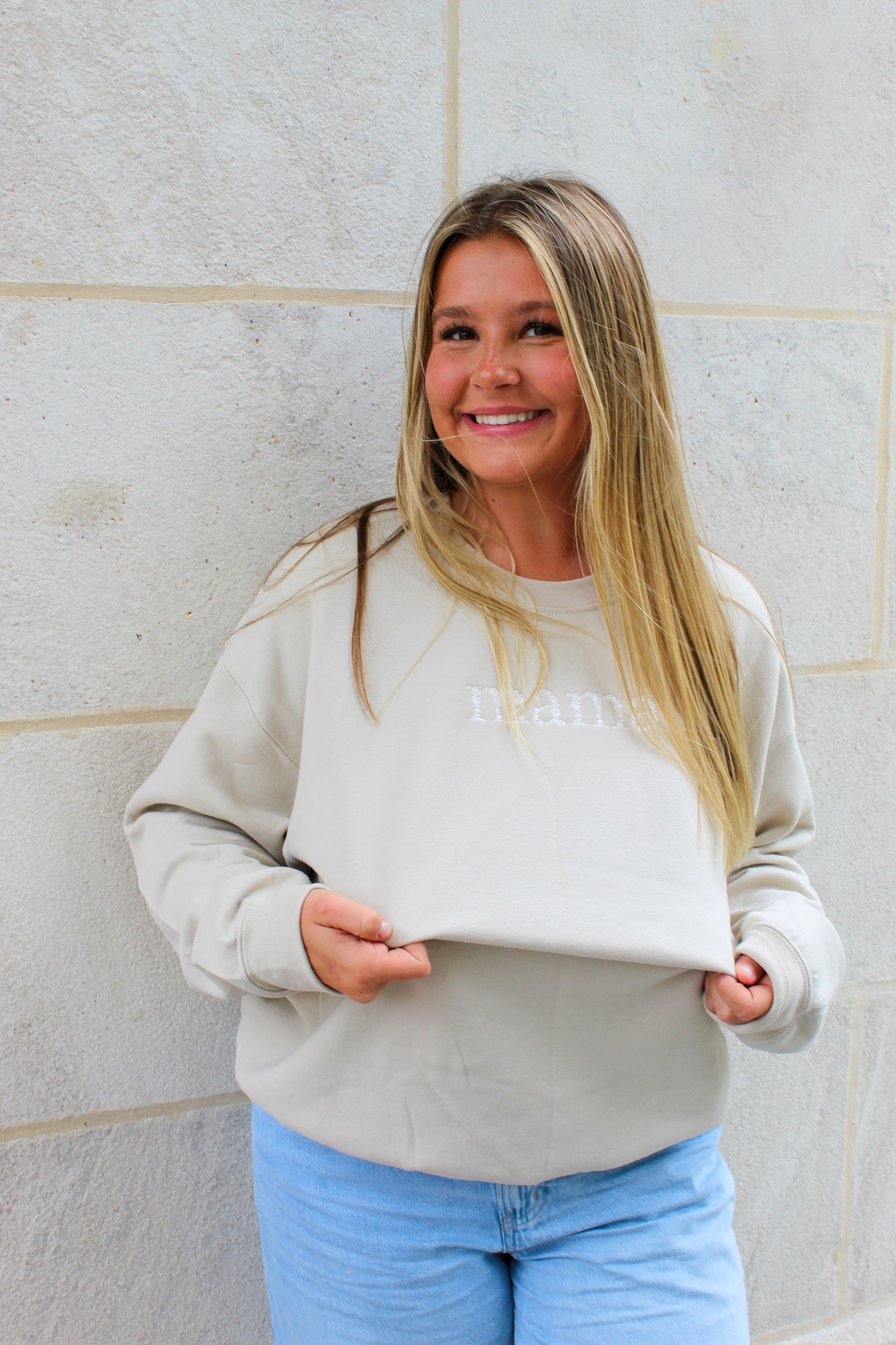 Stay cozy and stylish with Simple Mama Embroidery, a tannish cream sweatshirt featuring a crisp white "mama" embroidery. Made from high-quality fabric, this sweatshirt is a perfect blend of comfort and fashion. Stay on-trend while proudly showcasing your role as a mother.