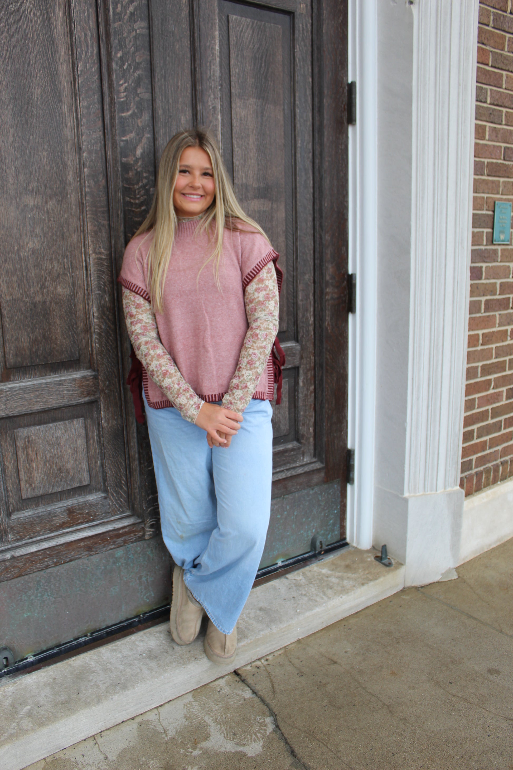 This professional sweater vest features a two-toned design and elegant bow accents on each side. Made with high-quality materials, it adds a sophisticated touch to any outfit. Perfect for business or formal occasions, the vest exudes class and style.